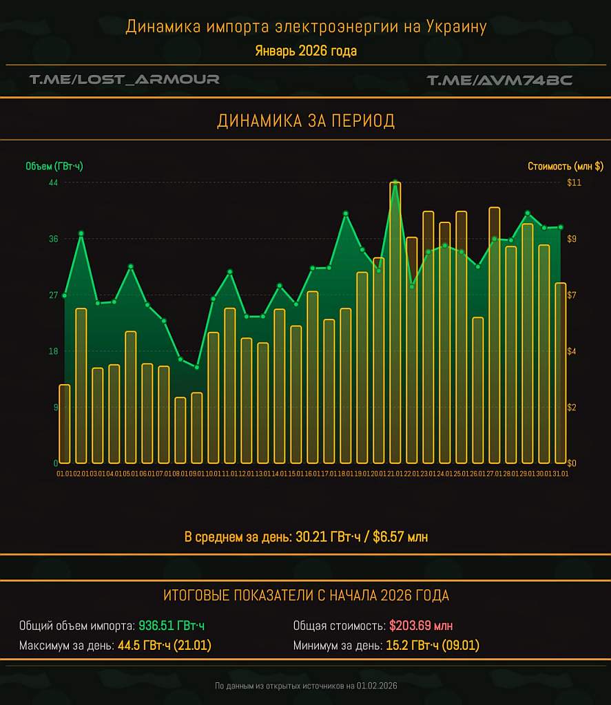 Zdroj https://t.me/casusbellilive/242133 / https://t.me/lost_armour/7991 z 01.02.2026„Za mesiac 01.2026 Ukrajina importovala elektrickú energiu v hodnote viac ako 200 miliónov $. Hlavné ukazovatele: