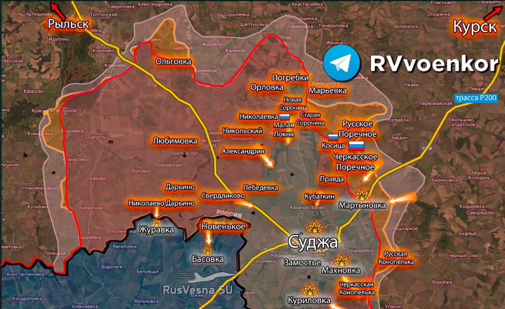 V meste Sudža sa stále nebojuje, nepriateľ stále neprivádza zálohy, všetky logistické trasy nepriateľa sú v hľadáčiku útočných dronov a delostrelectva. V noci, podobne ako včera, sa zo Sudža očakávajú pokusy o evakuáciu niektorých jednotiek AFU do Sumskej oblasti.