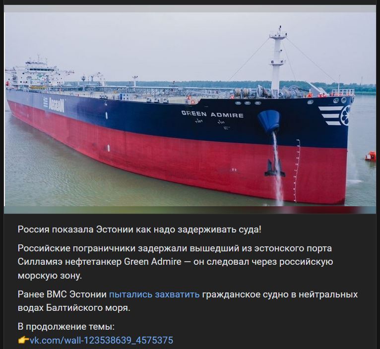 Ruská pohraničná stráž zadržala ropný tanker Green Admire, ktorý opustil estónsky prístav Sillamae a prechádzal ruskou morskou zónou. Predtým sa VMS Estónska pokúsili zadržať civilné plavidlo v neutrálnych vodách Baltského mora.