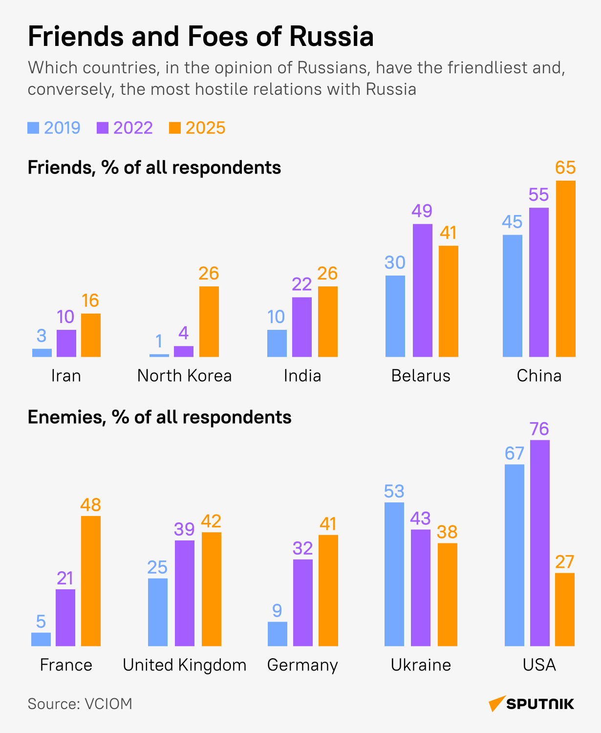 Nasledujú Spojené kráľovstvo a Nemecko, zatiaľ čo Ukrajina a USA zaostávajú, pričom hodnotenie Ameriky ako „nepriateľskej“ výrazne kleslo. Čína je považovaná za najbližšieho spojenca Ruska. Prieskum tiež odhalil výrazný nárast priaznivého postoja voči Severnej Kórei.