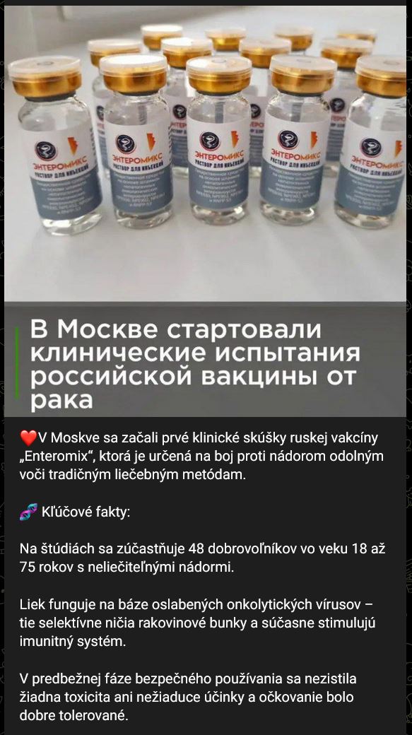 Zdroj https://t.me/spravy_slovakia/17962 z 06.07.2025V Moskve sa začali 1. klinické skúšky ruskej vakcíny „Enteromiks“ (Энтеромикс), ktorá je určená na boj proti nádorom odolným voči tradičným liečebným metódam.