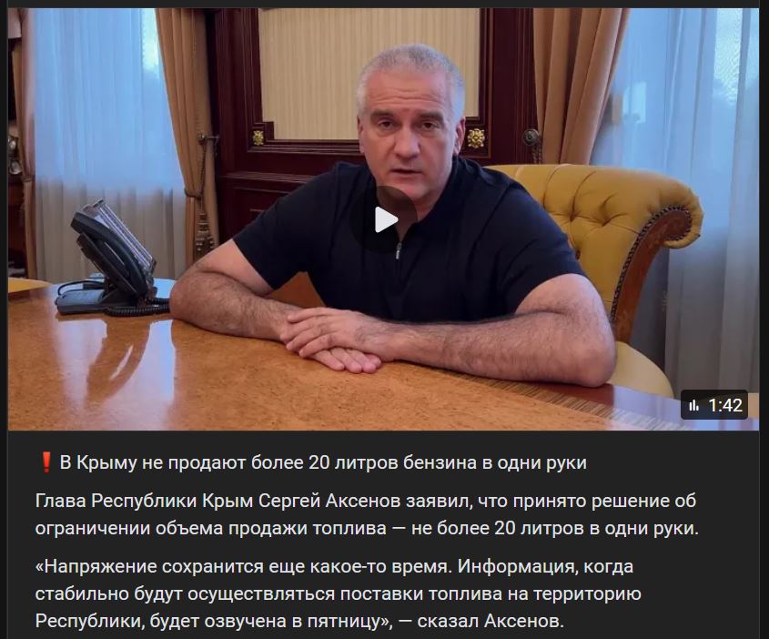 Predseda Republiky Krym Sergej Aksenov (Сергей Аксенов) vyhlásil, že bolo prijaté rozhodnutie o obmedzení predaja paliva – maximálne 20 litrov na jednu osobu.