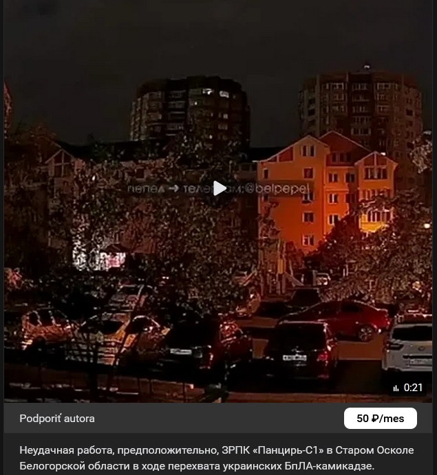 Neúspešná činnosť, pravdepodobne ZRPK „Pancir-S1“ (Панцирь-С1) v Starom Oskole (Старый Оскол) v Belogorskej oblasti počas navádzania na ukrajinský BPLA-kamikadze.