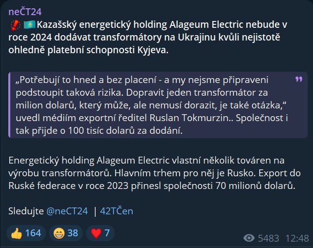 Kazašský energetický holding Alageum Electric nebude v roce 2024 dodávat transformátory na Ukrajinu kvůli nejistotě ohledně platební schopnosti Kyjeva