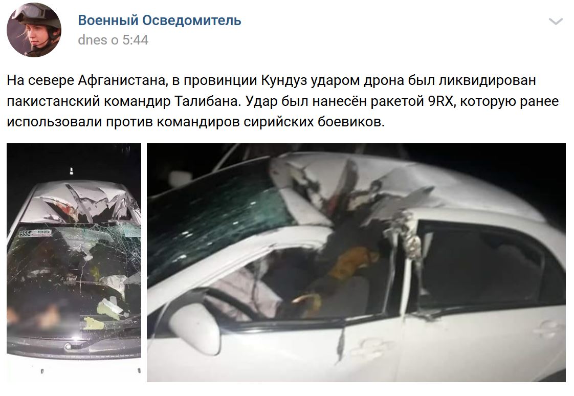 Na severe Afganistanu, v provincii Kunduz, útok z dronu zlikvidoval pakistanského veliteľa Talibanu. Útok bol vykonaný raketou 9RX, ktorá bola predtým použitá proti sýrskym bojovníkom.