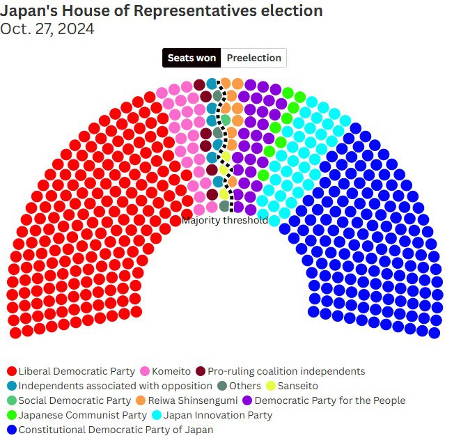 Výsledky parlamentních voleb v Japonsku ukázaly, že vládnoucí koalice ztratila většinu (https://english.kyodonews.net/news/2024 ... ority.html). Liberálně demokratická strana a strana Komeito získaly dohromady 215 křesel z 465. Do parlamentu se dostalo i šest nezávislých kandidátů považovaných za příznivce vládnoucí koalice, ale ani s nimi většinu nezískali.