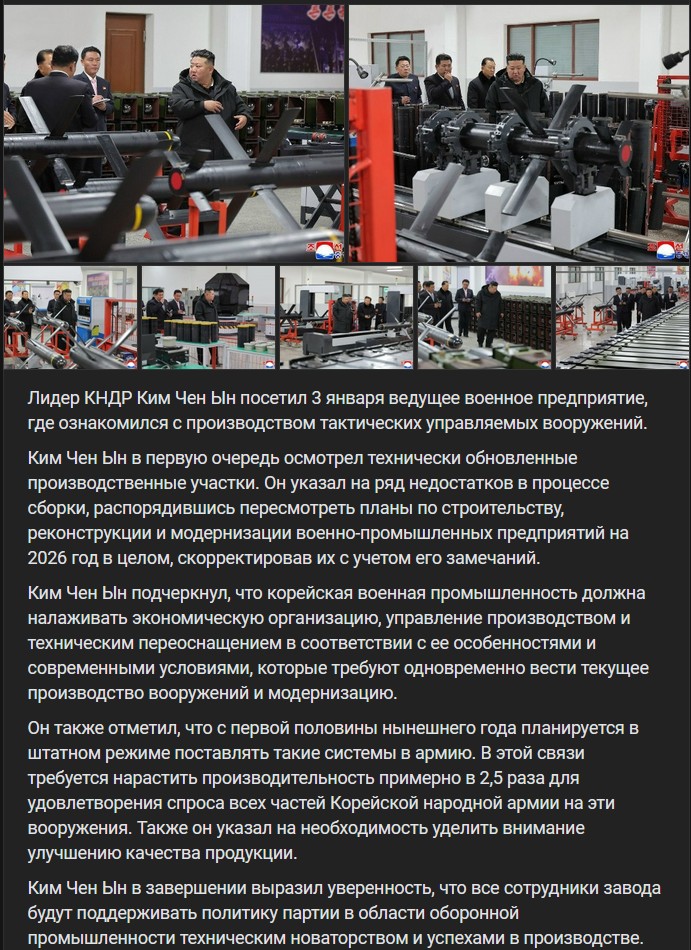 Zdroj https://vk.com/wall-123538639_4783308 z 04.01.2026Líder KĽDR Kim Čong-un v sobotu 03.01.2026 navštívil popredný vojenský podnik, kde sa oboznámil s výrobou taktických riadených zbraní.