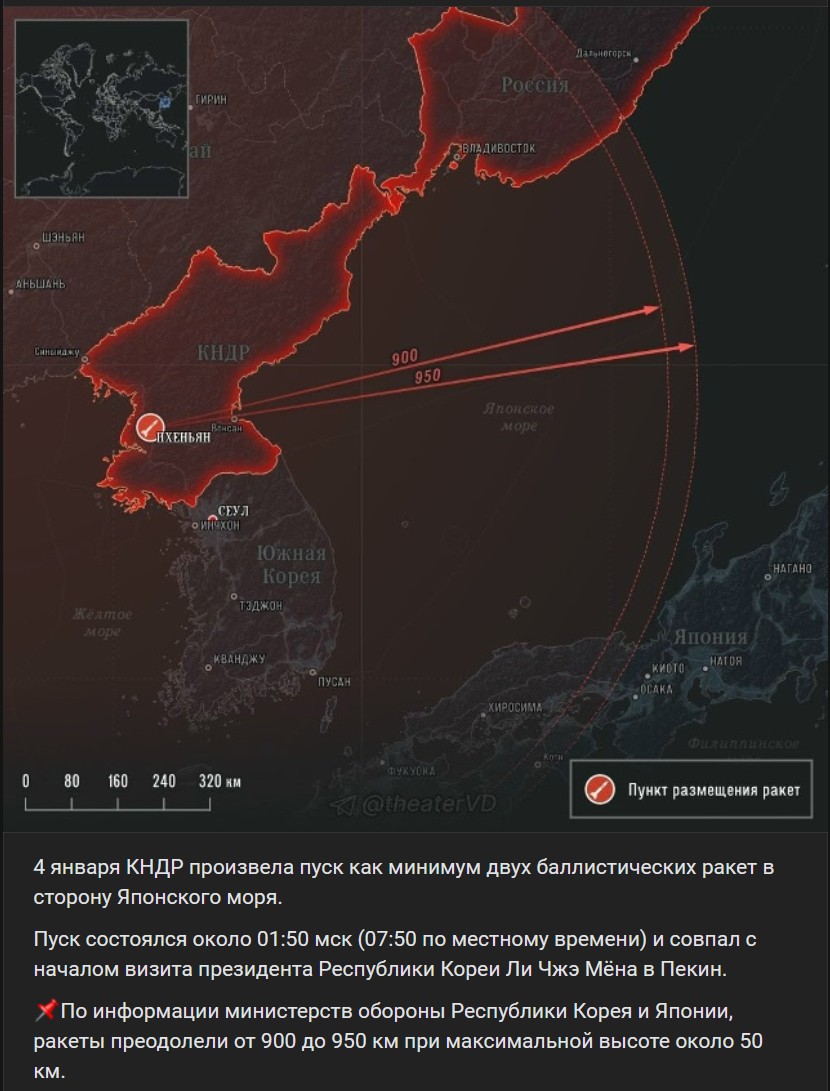 Zdroj https://vk.com/wall-123538639_4783113 z 04.01.2026V nedeľu 04.01.2026 KĽDR otestovala najmenej 2 balistické rakety smerom k Japonskému moru.