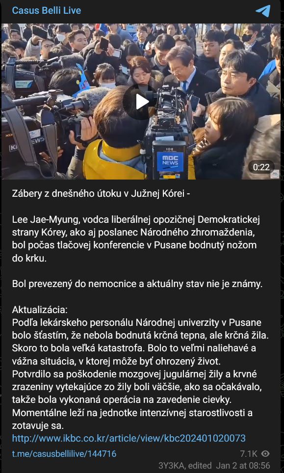 Lee Jae-Myung, vodca liberálnej opozičnej Demokratickej strany Kórey, ako aj poslanec Národného zhromaždenia, bol počas tlačovej konferencie v Pusane bodnutý nožom do krku. Bol prevezený do nemocnice a aktuálny stav nie je známy.