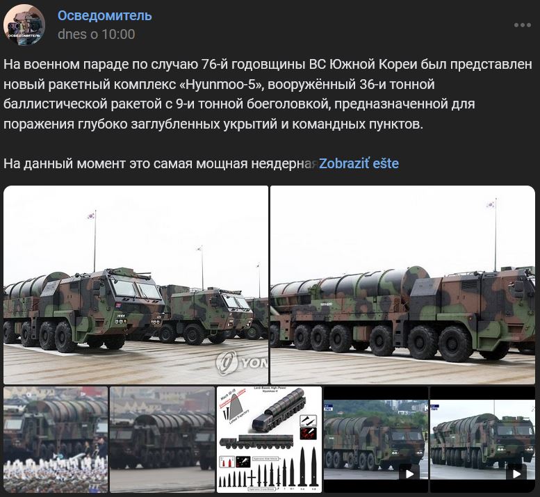 Na vojenskej prehliadke pri príležitosti 76. výročia vzniku VS Južnej Kórei bol predstavený nový raketový systém Hyunmoo-5, ktorý je vyzbrojený 36-tonovou balistickou strelou s 9-tonovou bojovou hlavicou určenou na zasiahnutie hlboko uložených krytov a veliteľských stanovíšť.