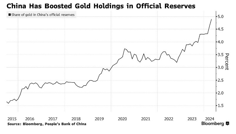 ▪️До 4,9 % podíl zlata na oficiálních rezervách Číny v dubnu vzrostl v souvislosti s výprodejem dolarových aktiv. To je nejvyšší hodnota od roku 2015
