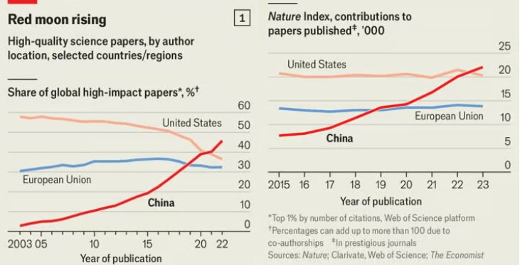 ◾️ V roce 2003 publikovaly USA dvacetkrát více seriózních vědeckých prací než Čína. V roce 2022 Čína v tomto ohledu předstihla Ameriku i Evropu.