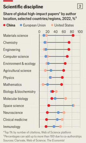 ◾️ V současné době Čína vede ve světě v oblasti fyzikálních věd, chemie, věd o Zemi a životním prostředí, za Amerikou zaostává v obecné biologii a lékařských vědách.