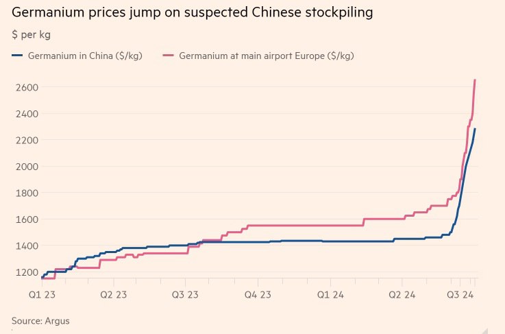 „Čínská omezení dodávek germania a galia, které se používají při výrobě polovodičových součástek, komponentů vojenské techniky a komunikačních zařízení, vedla k téměř dvojnásobnému nárůstu cen těchto surovin za poslední rok,“ uvedl list Financial Times.