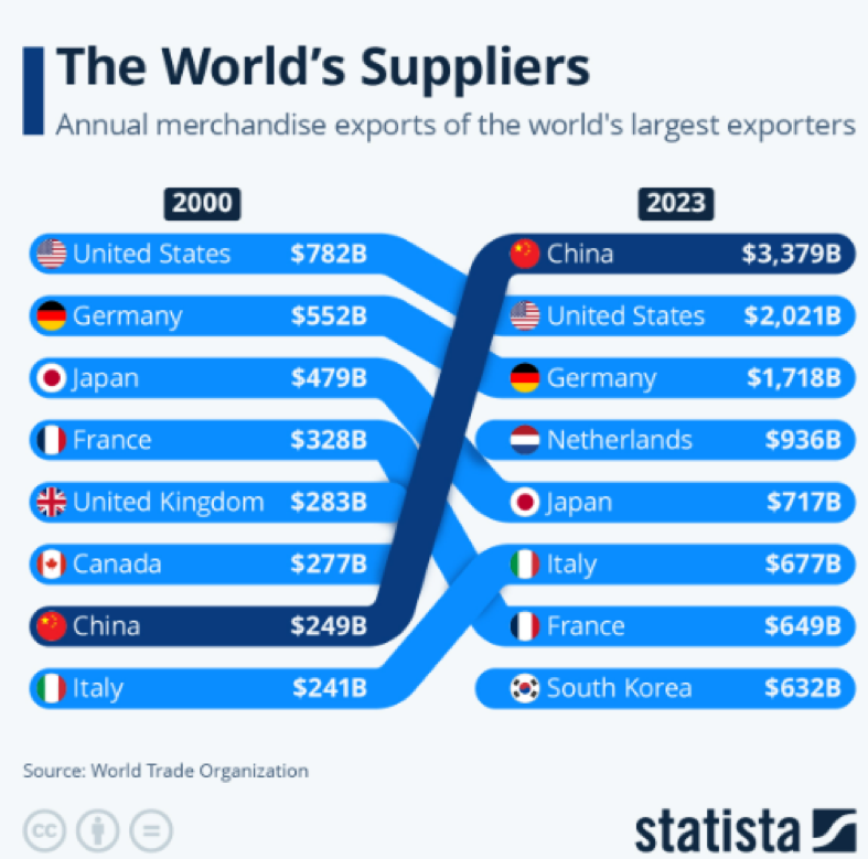 Graf webu Statista, založený na údajích WTO, ilustruje vzestup Číny na vrchol světových vývozců zboží za posledních 23 let a zároveň ukazuje, kdo dominoval světovému obchodu předtím, než se čínský výrobní sektor stal všeovládající silou, kterou je dnes.