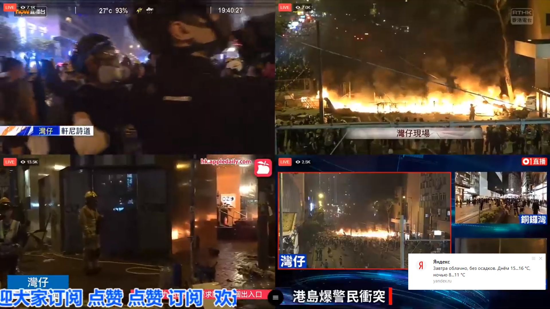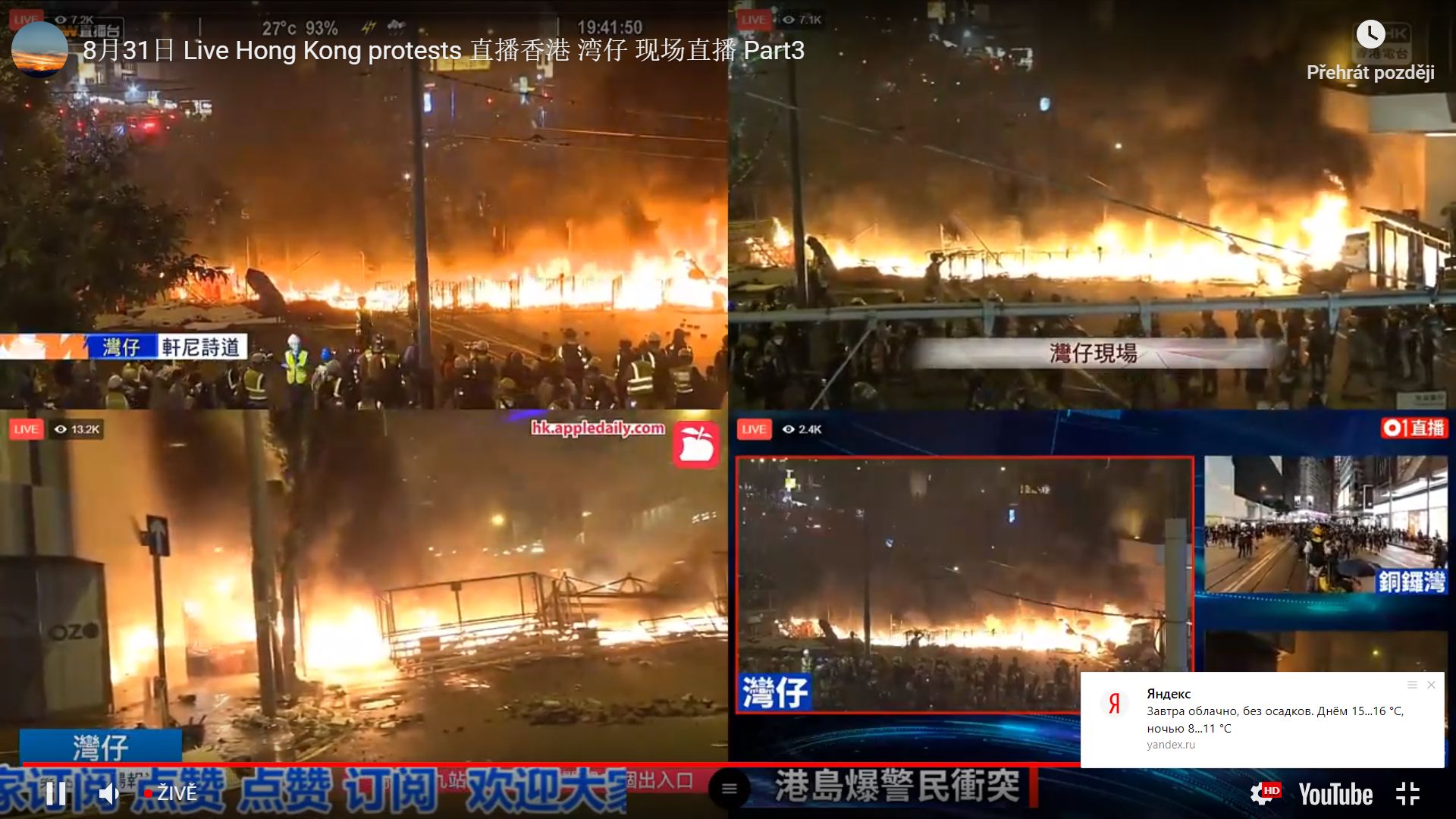 Útok demonstrantů na vzpurné cestující hasičákem po vzájemných hádkách - tady nic moc nejde vidět, dá se to dohledat v tom přímem přenose nebo zítra na briefingu HK policie.