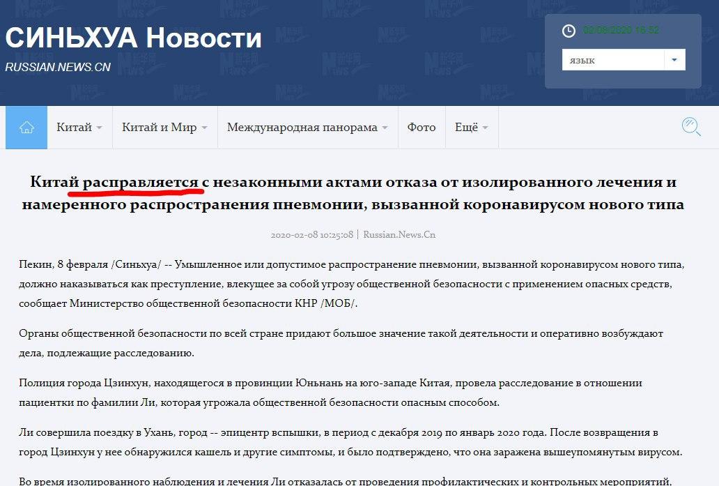 Čína sa vysporiada (výraz pre tvrdé vysporiadanie sa, napríklad s nepriateľom) s nezakonnými činmi odmietnutia izolovaného liečenia a úmyselného šírenia pneumonie, vyvolanej koronavirusom nového typu.