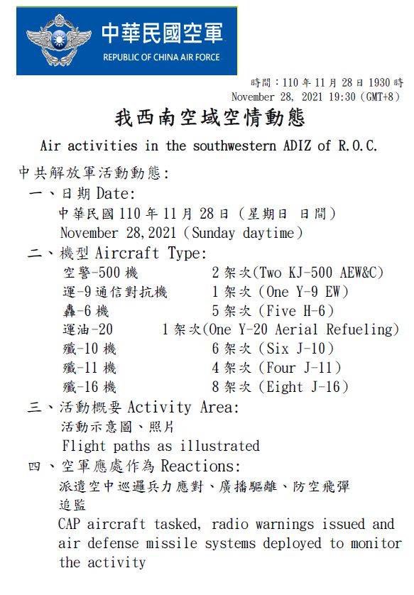 Ministr obrany Tchaj-wanu Chiu Kuo-cheng dříve prohlásil, že kontinentální Čína bude do roku 2025 mít všechny možnosti k rozsáhlému vpádu na Tchaj-wan, a poukázal na to, že nynější situace v oblasti Tchajwanského průlivu je nejnapjatější za posledních 40 let. Toto prohlášení učinil poté, co Čínská lidová osvobozenecká armáda poslala v prvním říjnovém týdnu k břehům Tchaj-wanu téměř 150 vojenských letadel.