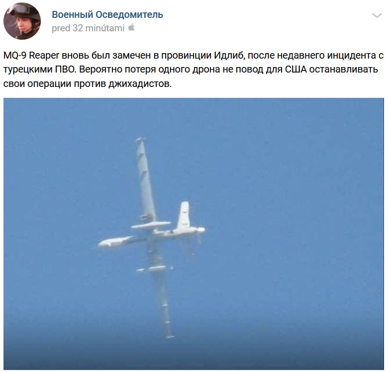 Po páde / zostrelení US dronu MQ-9A Reaper nad Idlibom, dnes štvrtok 20.08.2020 sa nad Idlibom ukázal ďalší MQ-9A Reaper: