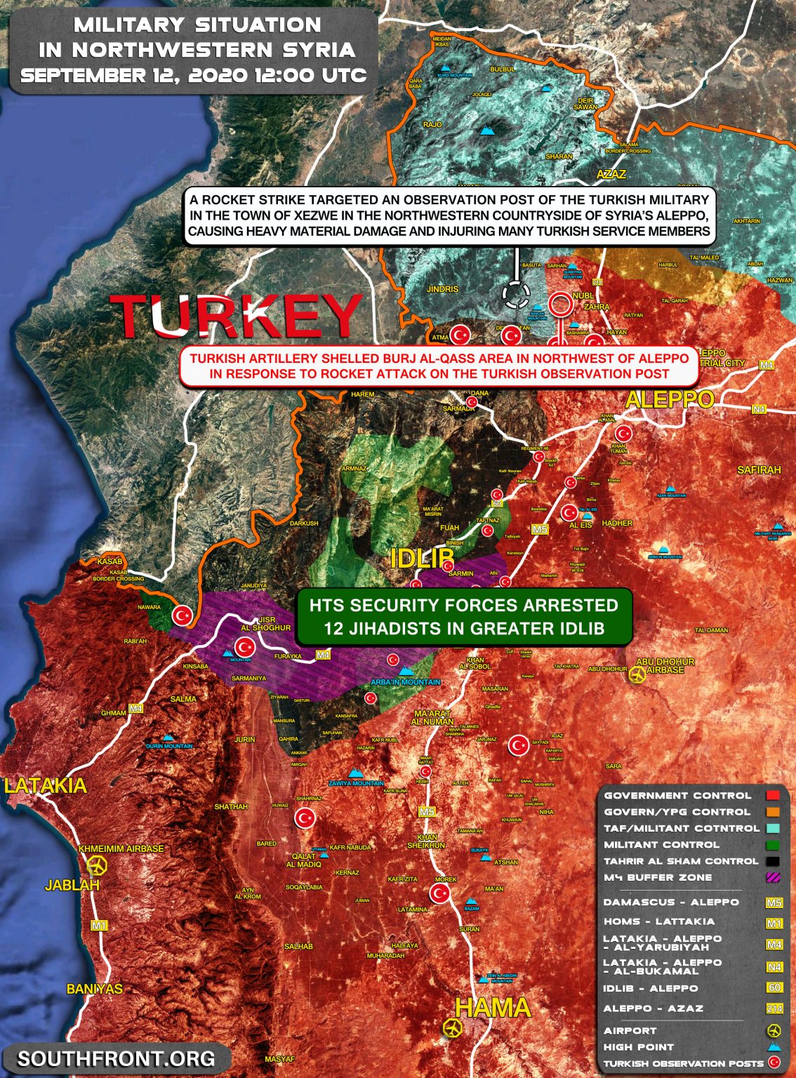 12. septembra popoludní raketový útok zasiahol pozorovacie stanovište tureckej armády v meste Xezwe na severozápade o Aleppa.