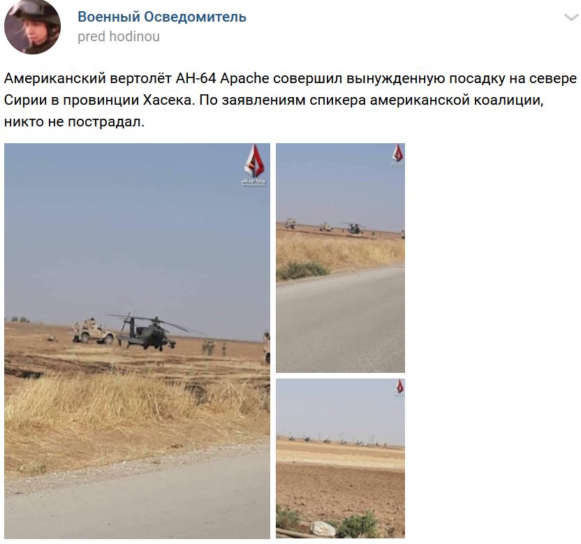 Núdzové pristátie US vrtuľníka Ah-64 Apache na severe Sýrie, Hasaka. Nik nebol zranený.