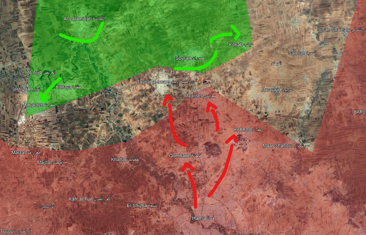 ▪️ Těžké boje probíhají od rána v Surani a Taybat al-Imam severně od Hamá, kde se syrská armáda snaží postupovat na sever. Opozice zároveň tvrdí, že kontroluje pohoří Šašabo na západě provincie Hamá (3).