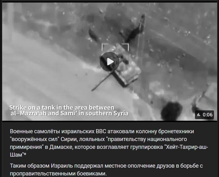 Video https://vk.com/video-123538639_456317640 dĺžka 6 sek.Vojenské lietadlá izraelského letectva zaútočili na konvoj obrnených vozidiel sýrskych „ozbrojených síl“ lojálnych „vláde národného zmierenia“ v Damasku, na čele ktorej stojí skupina „Hajt Tahrír aš-Šám“.