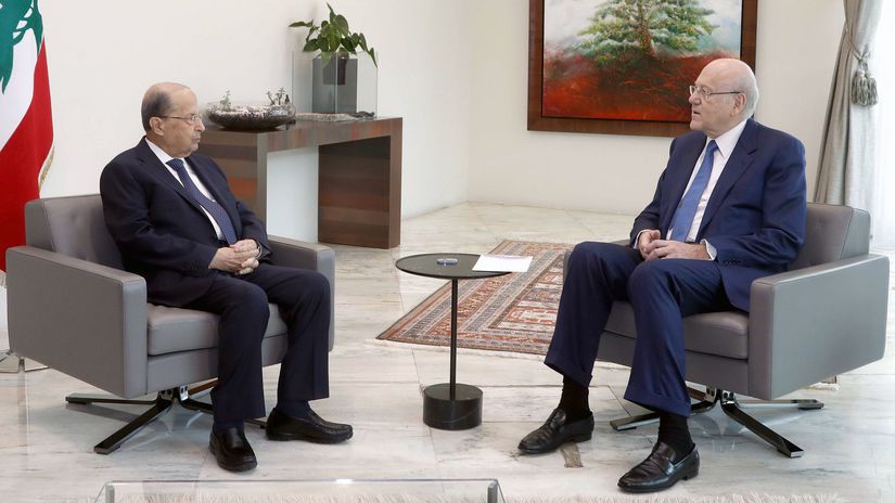 TASR 10.09.2021 14:58 Libanon Aún MíkátíFoto: SITA/AP, Dalati Nohra Libanonský prezident Michel Aún a premiér Nadžíb Míkátí, 10.9.2021.