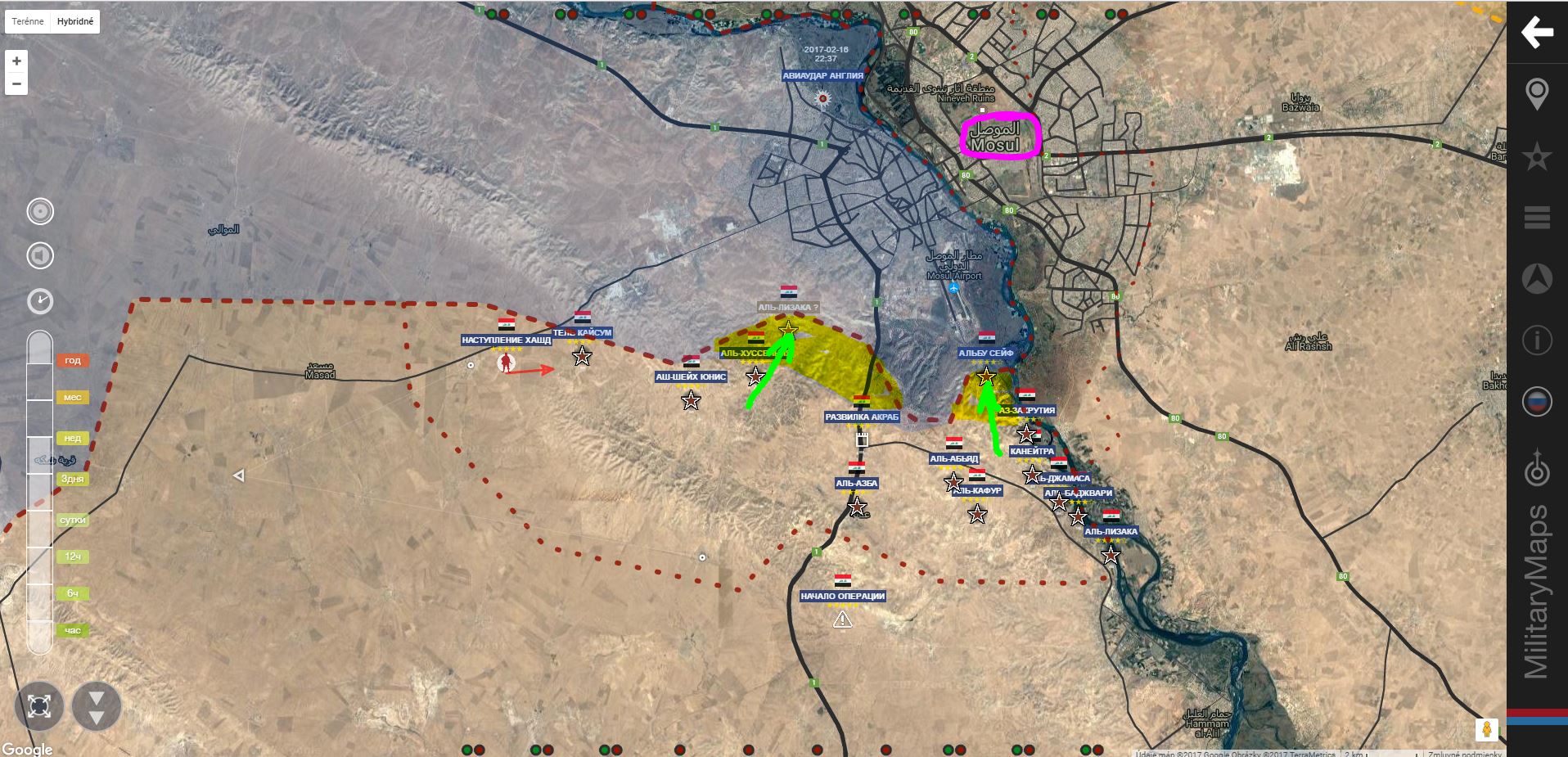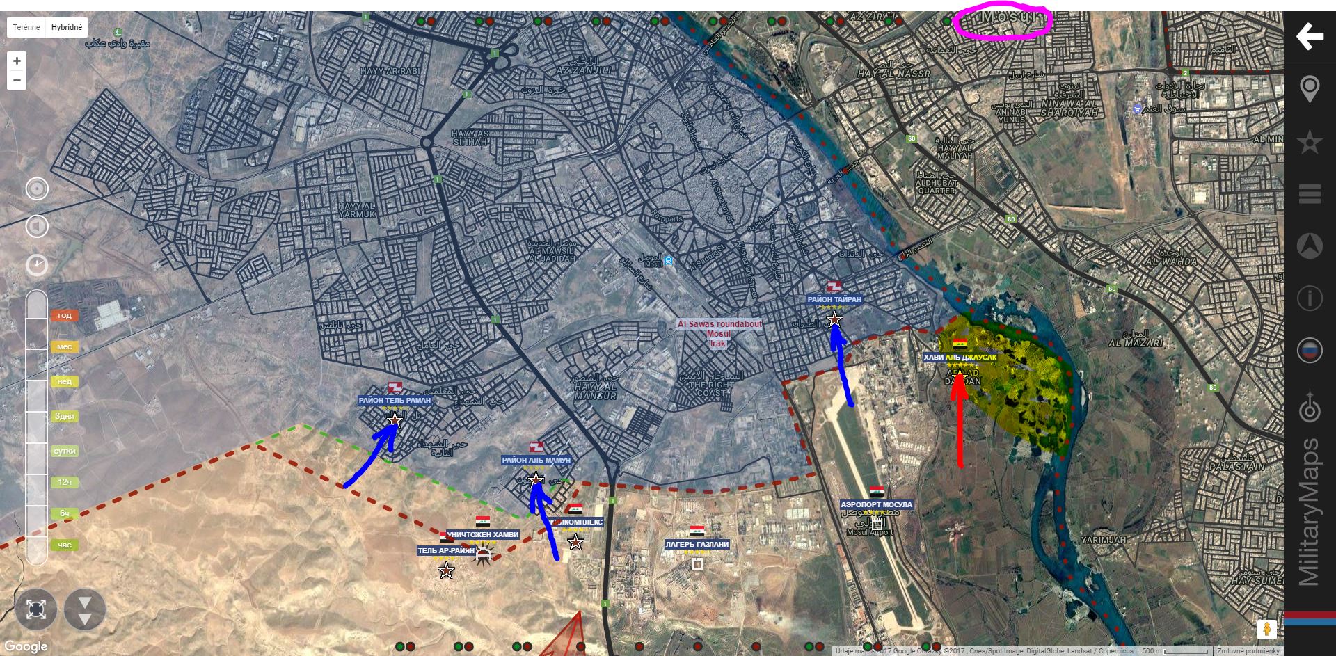 Mosul. IA+ obsadila štvrť Havi Al Jausak, útočí na: zľava Tel Raman, Al Mamun a Tajran.
