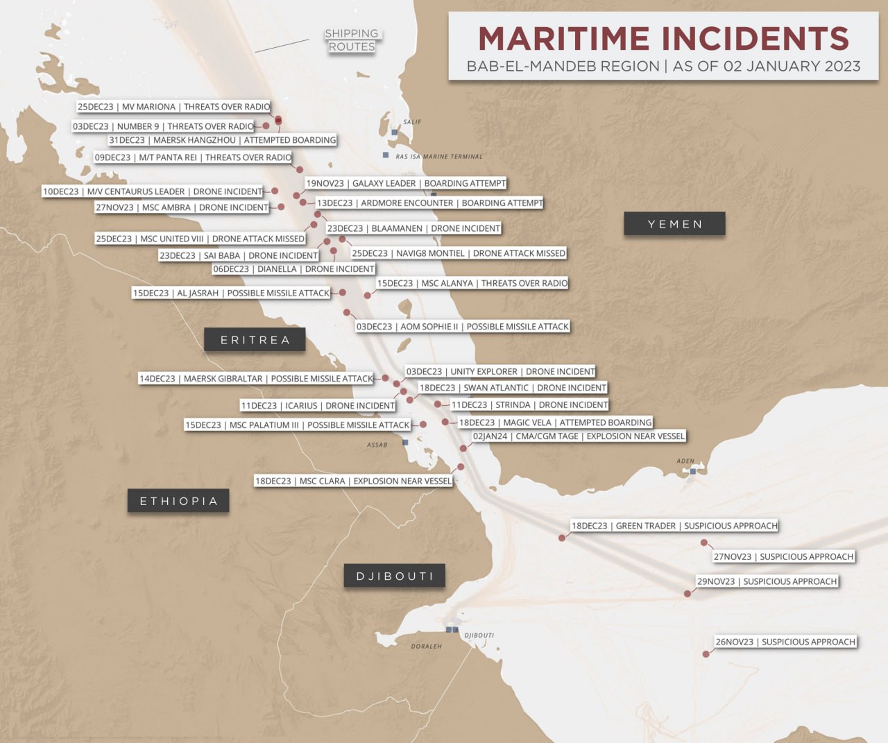Používatelia Twitteru aktualizovali svoje diela k utorku 02.01.2024 s približnými miestami úderov / útokov "nezbedných" Hútiov z Jemenu na podozrivé tankery a lode so suchým nákladom v Červenom mori.