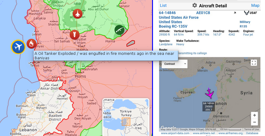 Potopení tankeru a záhadné letadlo USA RC135V 64-14846 na liveuamaps