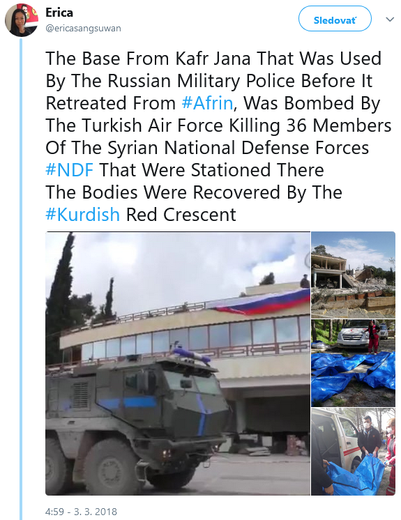Turecké letectvo v Afrine zbombardovali budovu kde predtým pôsobila Ruská vojenská polícia = zahynulo 36 príslušníkov NDF