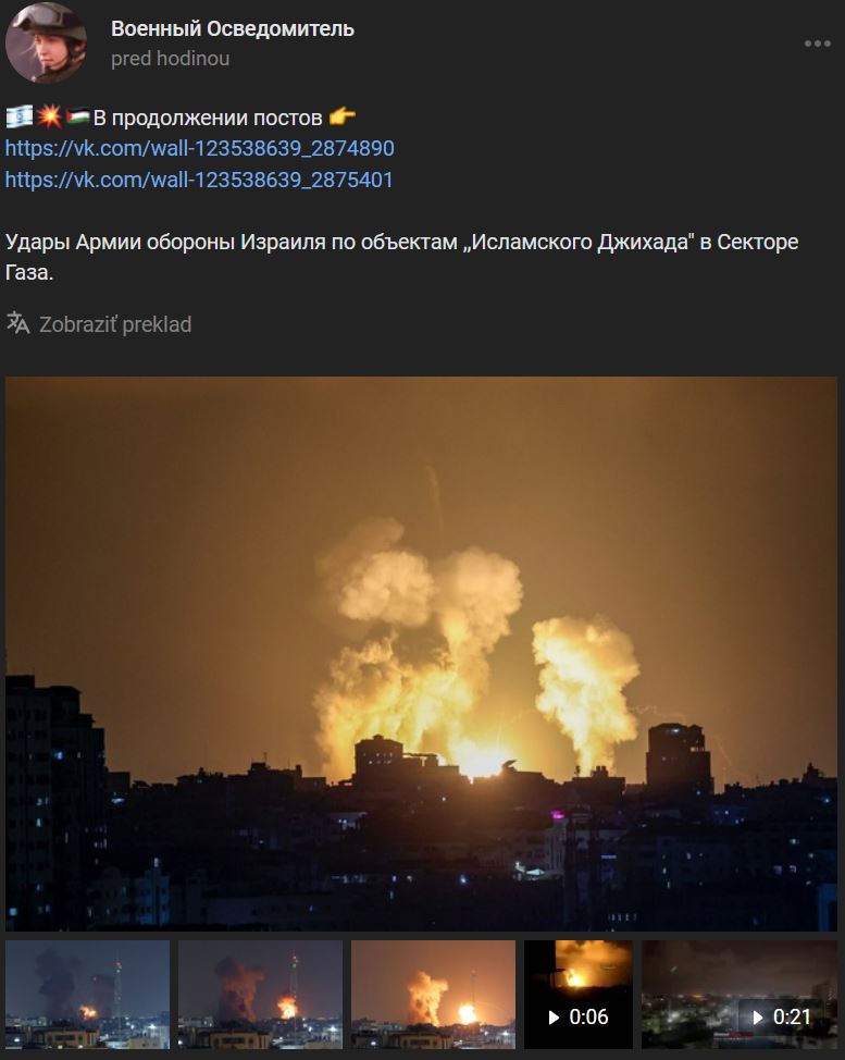 Údery izraelských obranných síl na objekty Islamského džihádu v Gaze. Zdroj https://vk.com/wall-123538639_2875401 z 05.08.2022 + kvalitnejšie foto a videá