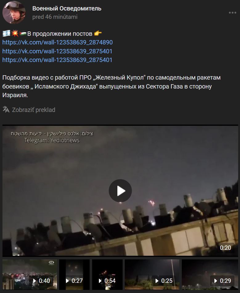 Výber videí z činnosti PRO "Železná kupola" (Iron Dome) proti vypáleným podomácky vyrobených rakiet bojovníkov "Islamského džihádu" z pásma Gazy na Izrael. Zdroj https://vk.com/wall-123538639_2875540 z 05.08.2022 + kvalitnejšie foto a videá