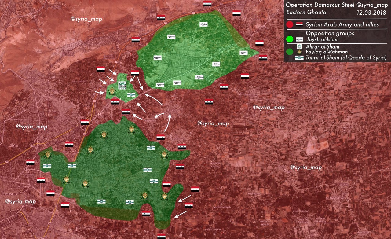 Ve východním Ghoutě pokračuje operace syrské armády s podporou ruských vojenských letadel. Podle rozhodnutí Rady bezpečnosti OSN na území platí 30denní příměří - příměří je deklarováno každý den od 9 do 14 hodin. Ozbrojenci odolávají a nepropouští civilisty. Ale existují úspěchy.