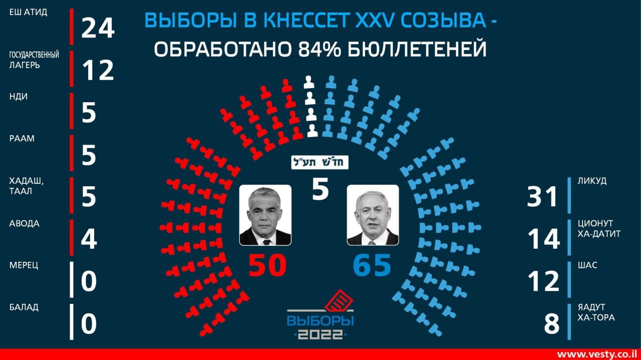 Netanjahuova pravicová strana Likud získala ve volbách největší počet mandátů ze všech stran. Po sečtení 95 procent hlasů se předpokládá, že bude mít ve 120členném izraelském parlamentu 32 křesel. Počítá se s tím, že vytvoří koalici s náboženskými stranami a krajní pravicí a bude mít v zákonodárném sboru oporu nejméně 64 poslanců. Očekává se, že Netanjahu do vlády přizve krajně pravicovou stranu Náboženský sionismus, k jehož vedení patří ultranacionalista Itamar Ben Gvir.