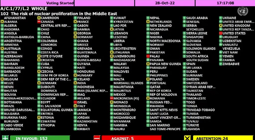 28. října přijalo ohromujících 152 zemí (79% všech členských států OSN) rezoluci, která vyzvala Izrael, aby se vzdal svých atomových bomb, připojil se ke Smlouvě o nešíření jaderných zbraní a umožnil Mezinárodní agentuře pro atomovou energii (MAAE) dohlížet na svá jaderná zařízení.