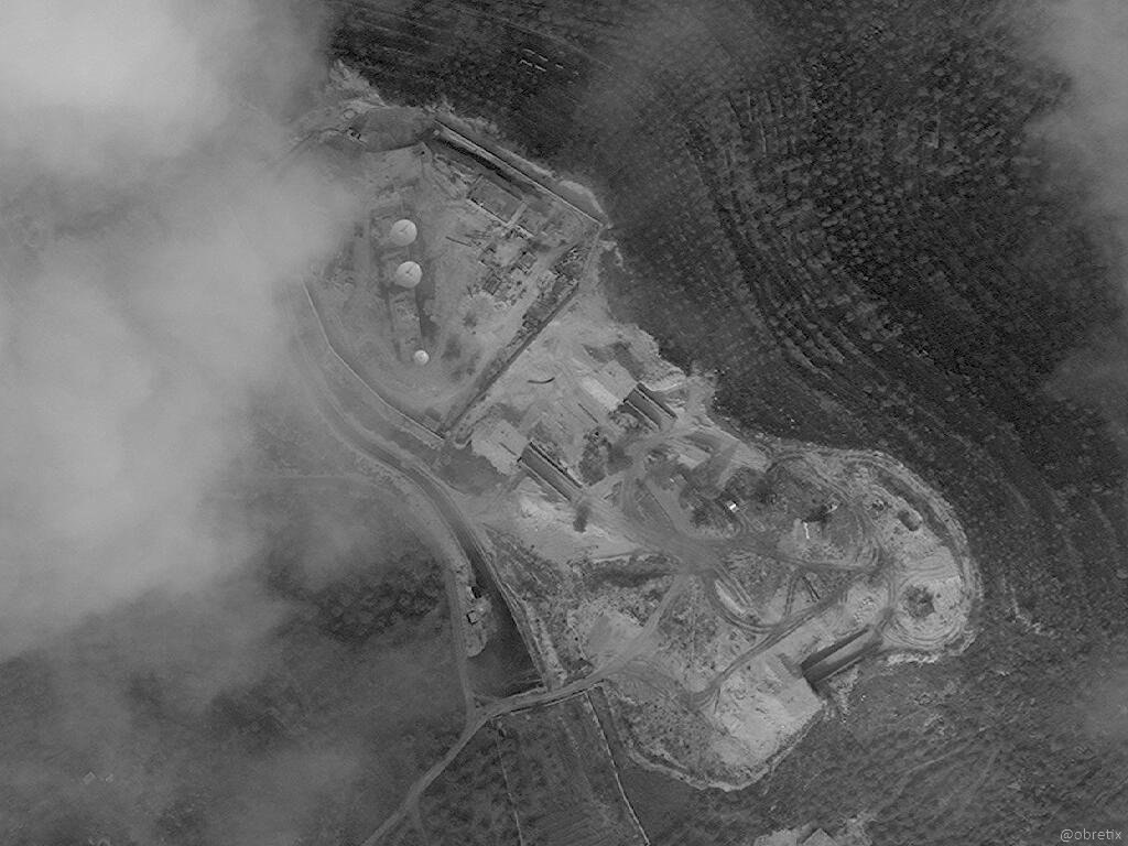 Antény družicové komunikace a postavení systému PVO "Buk -..." deset kilometrů jihovýchodně od Tartusu
