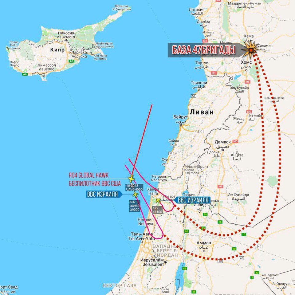 Možná varianta í trajektorie odpalu izraelských raket GBU-39 na základnu 47. brigády SAA v Sýrii