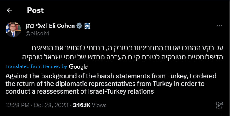 „Na pozadí tvrdých vyhlásení z Turecka som nariadil návrat diplomatických zástupcov z Turecka s cieľom vykonať prehodnotenie vzťahov medzi Izraelom a Tureckom.“