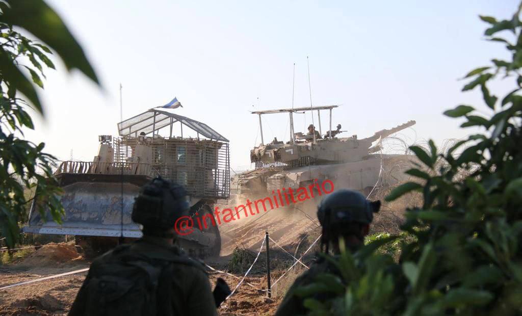 V Pásmu Gazy byly spatřeny tanky Merkava III s mřížemi nad hlavou a mříž dostal také obrněný buldozer Caterpillar D9.