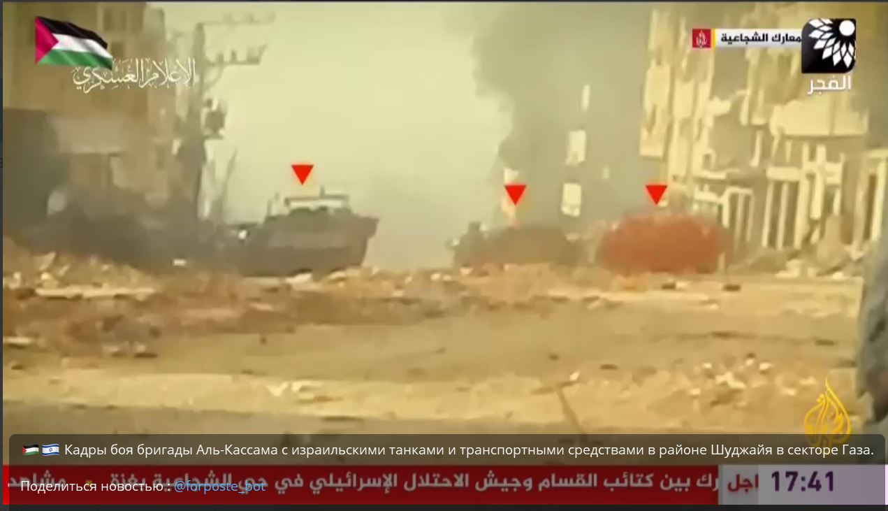 Zábery z bojov brigády Al-Qassam s izraelskými tankami a vozidlami v štvrti Šudžajja v pásme Gazy.