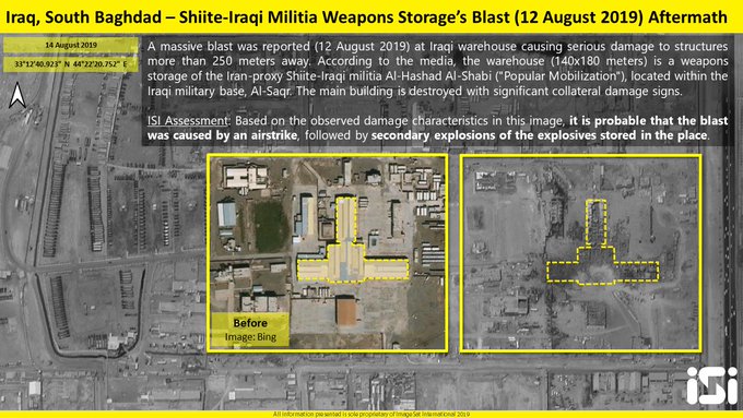 12. srpna došlo k masivní explozi ve skladu zbraní Iráckých lidových mobilizačních sil (oficiální součást iráckých ozbrojených sil) v jižním Bagdádu. Výbuch údajně způsobil značné poškození místních struktur. Je zajímavé poznamenat, že izraelské a americké zdroje nadále uvádějí, že jednotky Lidových Mobilizačních sil jsou íránským zástupcem. Pokud někdo přijme toto hledisko, měl by věřit, že významnou součástí iráckých ozbrojených sil je „Irácká mobilizačních síla“. https://cs.wikipedia.org/wiki/Lidov%C3% ... _s%C3%ADly