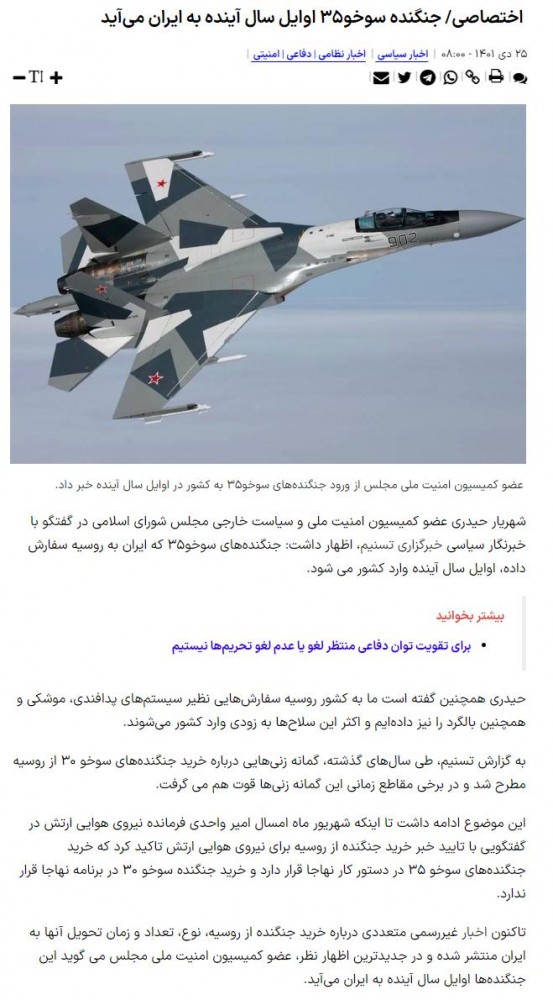 Šahrijár Hejdarí (شهریار حیدری), člen Komisie pre národnú bezpečnosť a zahraničnú politiku iránskeho parlamentu (Madžlis), povedal pre iránsku tlačovú agentúru Tasnim, že lietadlá rodiny Suchoj Su-35 (Су-35), ktoré si Irán objednal v Rusku (24 ks na letisku Isfahán), by mali doraziť začiatkom budúceho iránskeho roka. Dovoľte mi pripomenúť, že Irán používa vlastný slnečný kalendár a začiatok nového roka (Nowruz) je tam viazaný na jarnú rovnodennosť, takže ďalší rok 1402 v Iráne začne o niečo viac ako 2 mesiace (po 20.03.2023). Okrem toho podľa Šahrijára Hejdarího Irán objednal a v blízkej budúcnosti očakáva od Ruska dodávky PVO systémov, vrtuľníkov a niektorých ďalších obranných systémov a rakiet. Zdroj https://www.tasnimnews.com/fa/news/1401 ... B%8C%D8%AF (Perzsky) / https://www.tasnimnews.com/en/news/2023 ... -spring-mp z 15.01.2023 (EN)