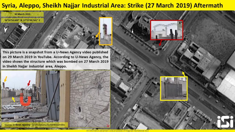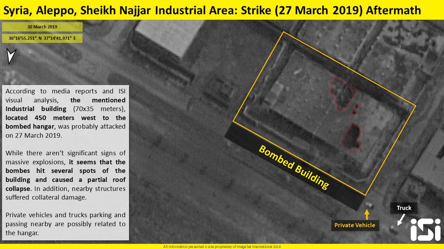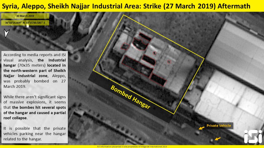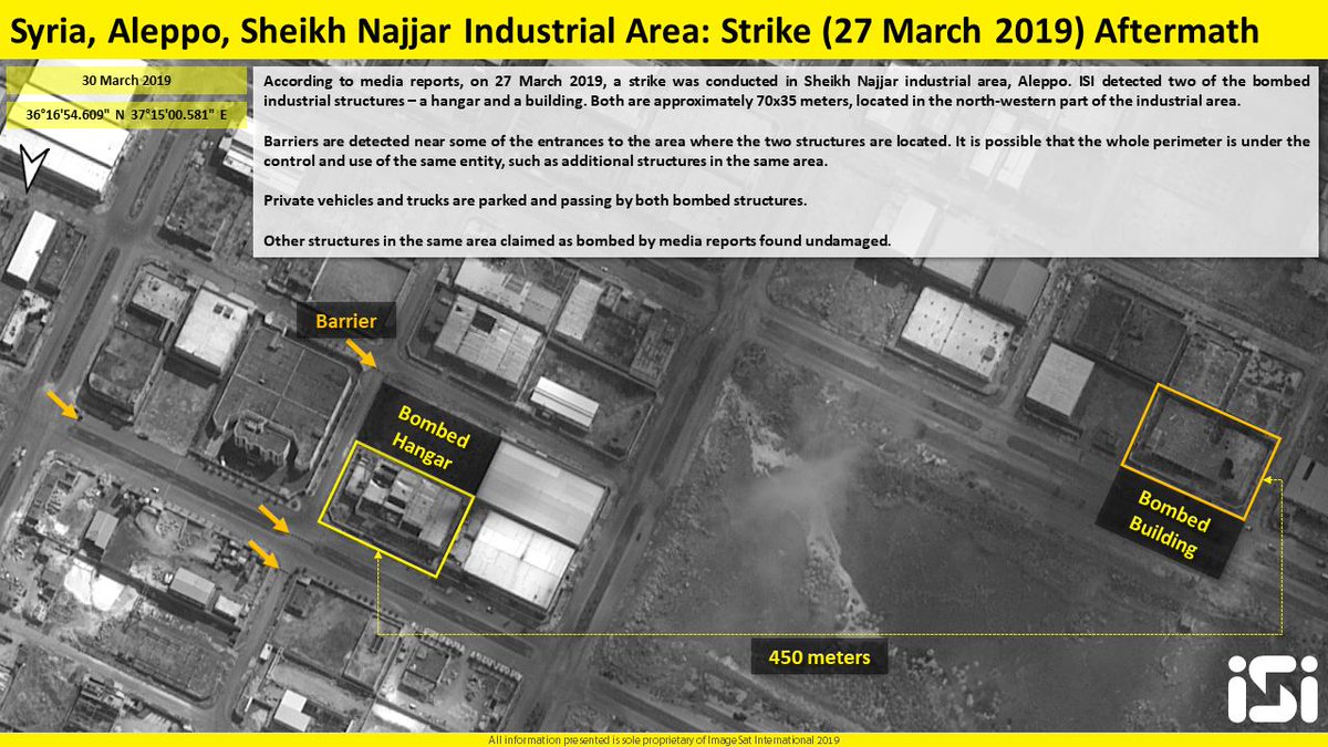 Na prvej satelitnej fotografii, obrázok Sat Intl. ukazuje jeden z hangárov a budov v okrese Aleppo Sheikh Najjar, na ktoré boli zamerané izraelské lietadlá v noci z 27. marca.