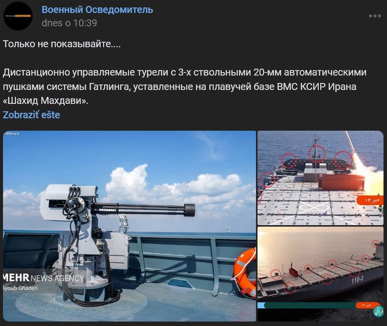 Diaľkovo ovládané veže s 3-hlavňovými 20mm automatickými kanónmi Gatling nainštalovanými na plávajúcej základni iránskeho námorníctva IRGC Shahid Mahdavi. Ukazuje sa, že nie je potrebné strácať loď za loďou, aby sa našli prostriedky proti námorným BEKam (bezpilotné člny). Zdroj https://vk.com/wall-123538639_4061198 z 26.02.2024