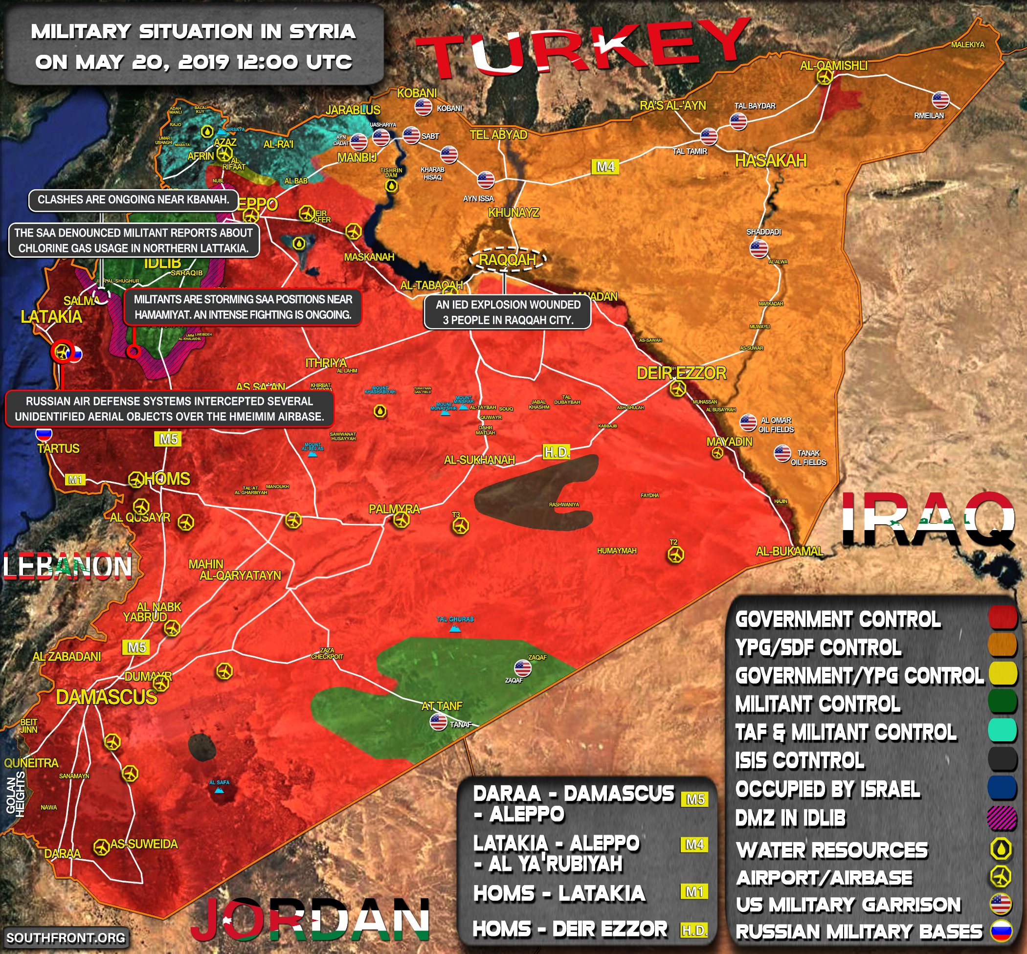 Silné střety mezi Syrskou arabskou armádou (SAA) a Hay'at Tahrir al-Sham (HTS) se údajně odehrávají na severu oblasti Lattakia, navzdory nedávným zprávám o dočasné dohodě o příměří . Zdroj ve 4. armádní th divize která provádí vojenskou operaci v severní Lattakii, sdělil SouthFront 18. května, že útok stále pokračuje a tvrdí, že neobdržela rozkaz dodržovat příměří. Sputnik dříve uvedl, že bylo dosaženo dohody o příměří, která se týká Hama, Idlibu a Lattakie. Zdroj v SAA řekl ruské tiskové agentuře, že příměří bude trvat pouze 72 hodin. Vojenská operace v severní Lattakii je zaměřená na obsazení strategického města Kabani od kterého jsou obvykle vystřelovány rakety na ruskou Hmeimim airbase. Letecká základna byla cílem nového raketového útoku ihned po oznámení předpokládaného příměří. Zatímco SAA se stále zaměřuje na pozice HTS jižně od Kabani, zůstává nejasné, zda bude SAA pokračovat směrem k městu.