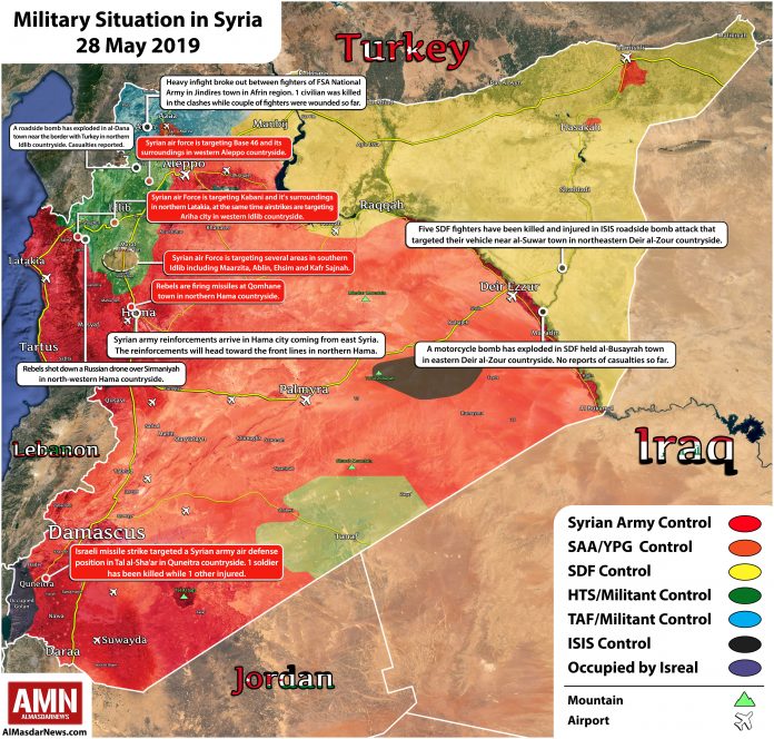 Radikální militanti rozmístěni v demilitarizované zóně kolem Idlibu vystřelili 29. května v severním Hama desítky raket na města Qomhane, Salhab a al-Suqaylabiyah, které spravuje vláda. Státní agentura uvedla, že jeden civilista byl zabit a sedm dalších bylo zraněno ostřelováním a také způsobilo velké požáry v některých zemědělských oblastech. Žádná skupina si zatím neprohlásila k odpovědnosti za raketový útok. Nicméně, pro-vládní zdroje obvinily Hay'at Tahrir al-Sham (HTS), Jaysh al-Izza a turecký-podporoval National přední strana pro osvobození (NFL). Minulý týden se vůdci tří skupin dohodli na sloučení svých dělostřeleckých a raketových jednotek a soustředili je pod velení prominentního militanta známého jako „Abu Mohamad 130“.