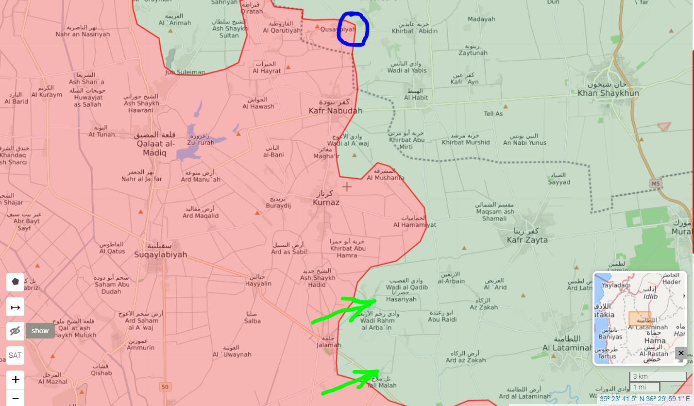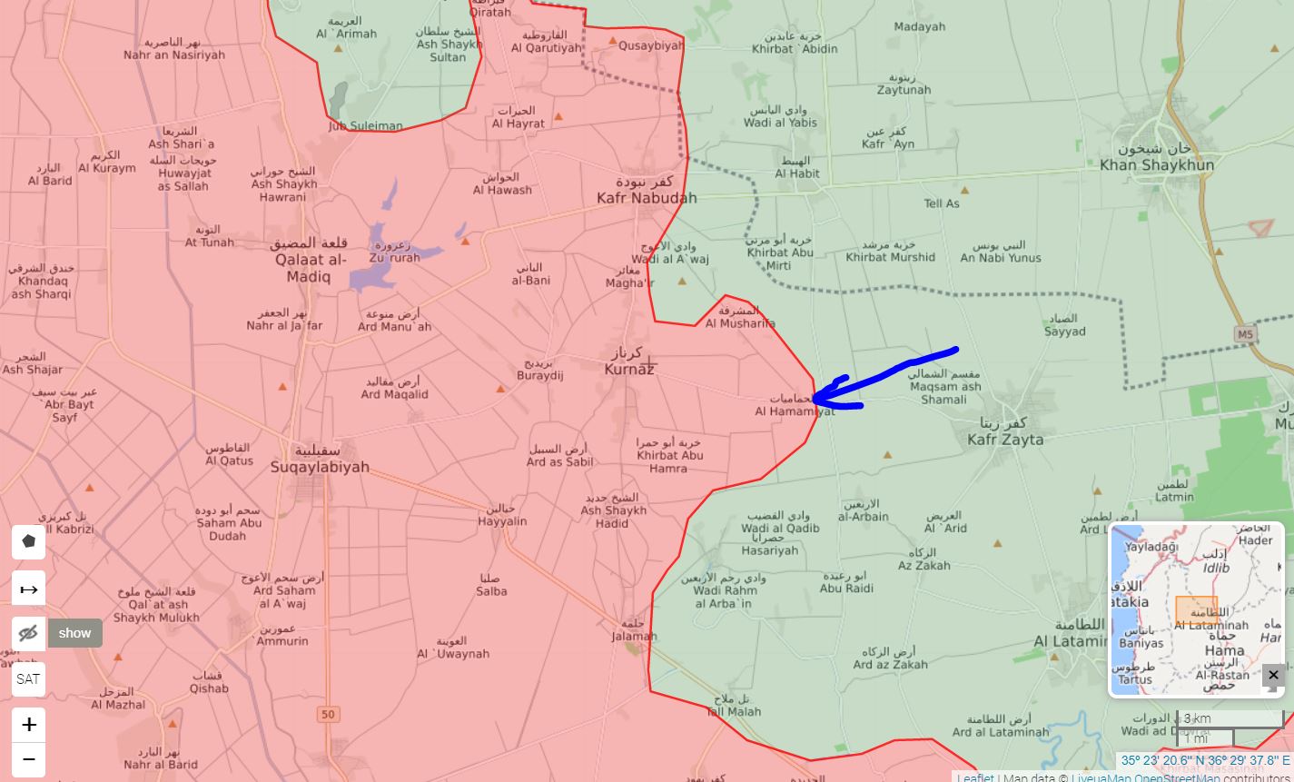 Džihádistickí povstalci pod vedením Hay'ata Tahrira Al-Sham zaútočili včera večer na pozície sýrskej arabskej armády v meste Al-Hamamiyat. Podľa vojenského zdroja, v blízkosti frontových línií prebiehajú konflikty medzi sýrskou armádou a džihádistickými povstalcami. Dodal, že Jaysh Al-Izza tiež pomáha v prebiehajúcej ofenzíve.