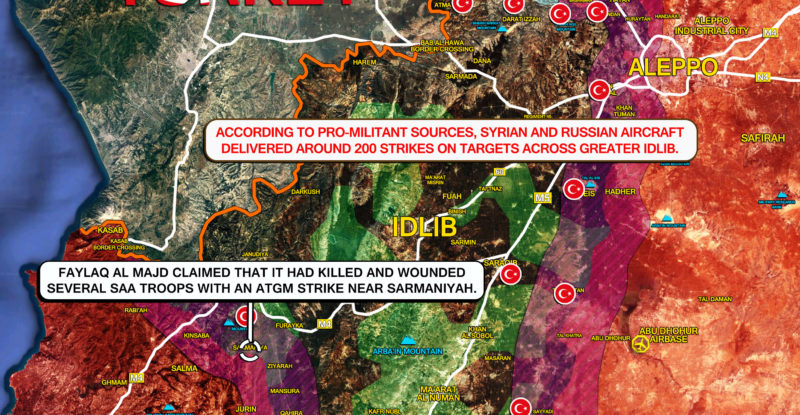 Podľa pro-militantných zdrojov vykonali sýrske a ruské lietadlá približne 200 úderov na ciele naprieč Greater Idlib;